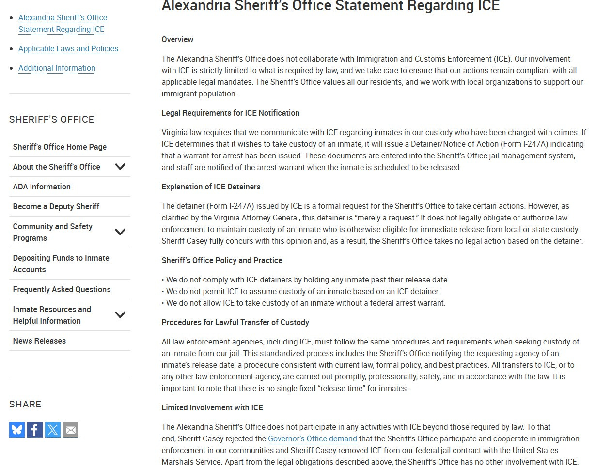 In contrast, the Alexandria Sheriff’s Office Statement Regarding ICE on the city’s website states, under Sheriff’s Policy and Practice: